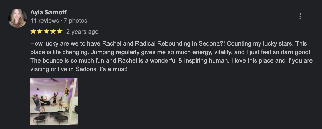 I have been rebounding for a few weeks now and I absolutely love it. I am an exercise junkie and have tried almost every sport out there. Rebounding is so much fun and effortless. Rachel makes it not just an incredible workout but an amazing experience! From the uplifting music to opening your heart chakra at the end I can’t get enough. It is my absolute new favorite thing to do and every time I take her class I always have a great rest of my day! I couldn’t recommend Radical Rebounding more! Rachel is the BEST!!!❤️
