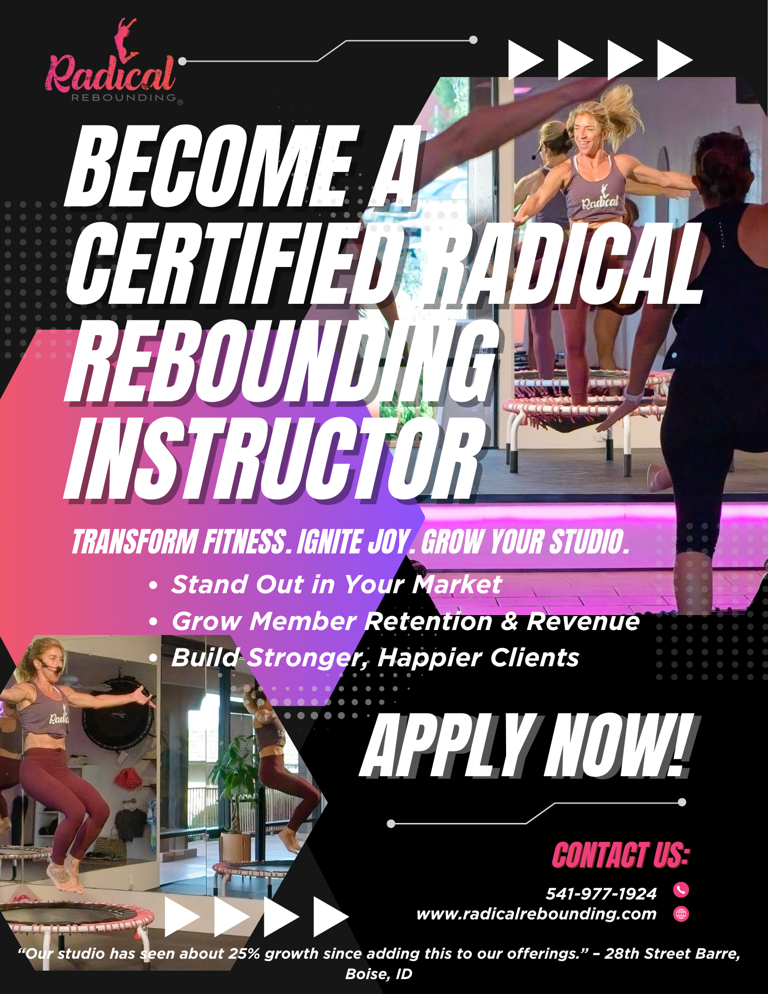 Give your members more than a workout — give them joy, energy, and a reason to choose your studio first. Radical Rebounding helps your business thrive while transforming lives, one bounce at a time.