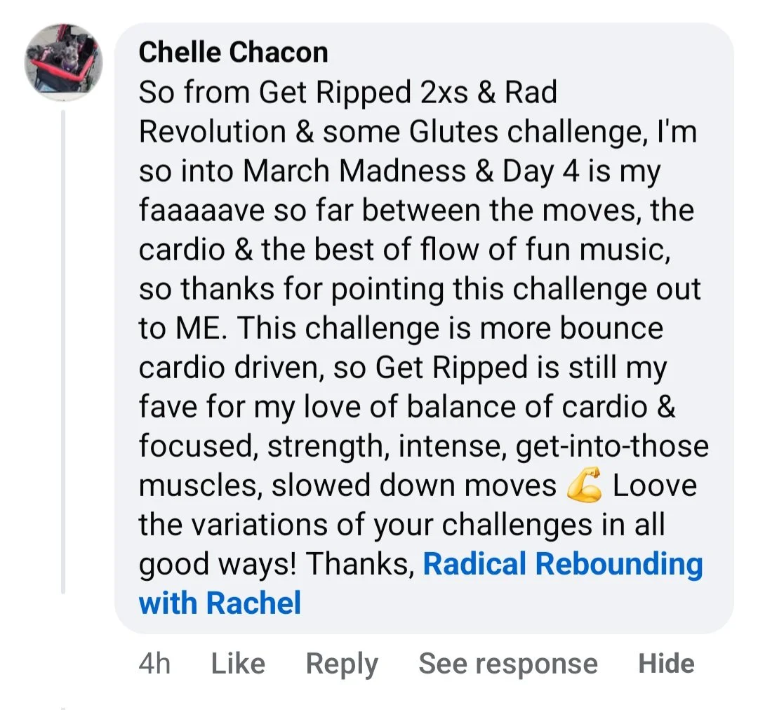 “In three months of Radical Rebounding I see strength in my body that I have never seen in years of strength training. I have energy beyond what any cardio has given me. And, for the first time in forever, intensely moving my body doesn't sap my energy for the day or leave me sore and in pain like everything else I have ever done.